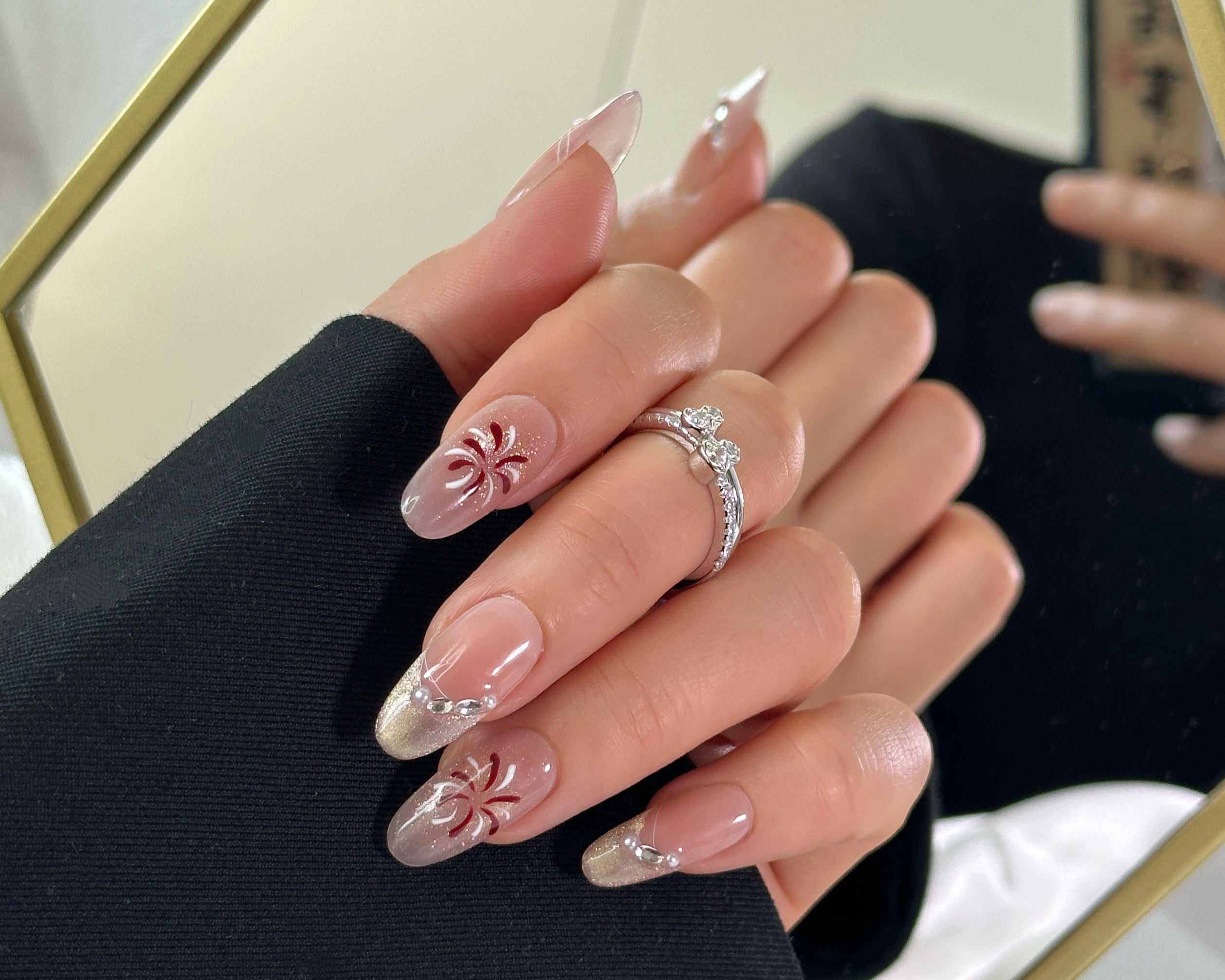 Unghie Press-on Ovale Lungo Elegante Russet Rosso Sfumato, Disegno Fiore a Mano EB002