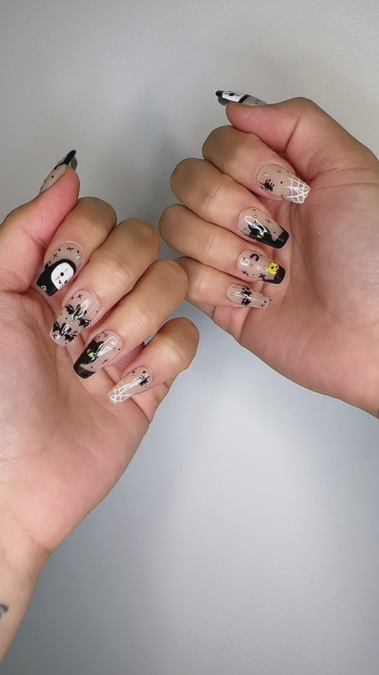 Unghie a Pressione Coffin Corto Halloween con Disegno di Pipistrelli Ragni Zucca e Gatto AB004