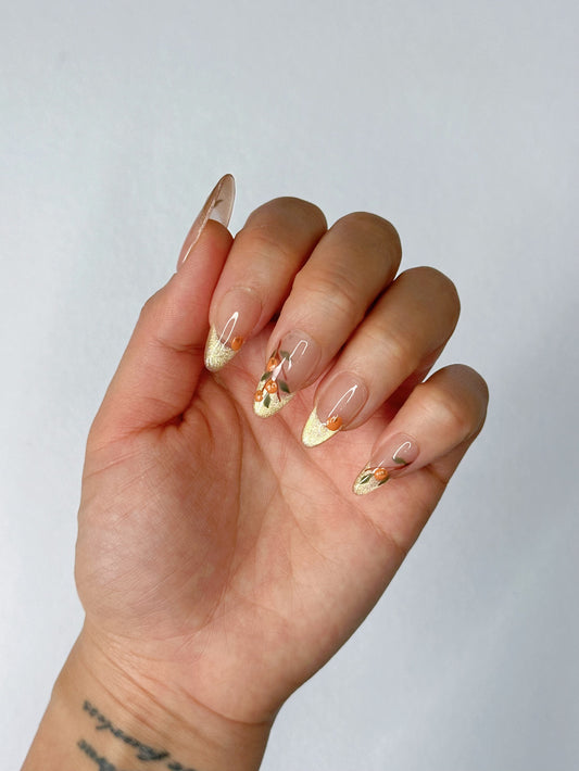 Unghie Press-on Ovale Lungo Elegante Russet Rosso Sfumato, Disegno Fiore a Mano EB002